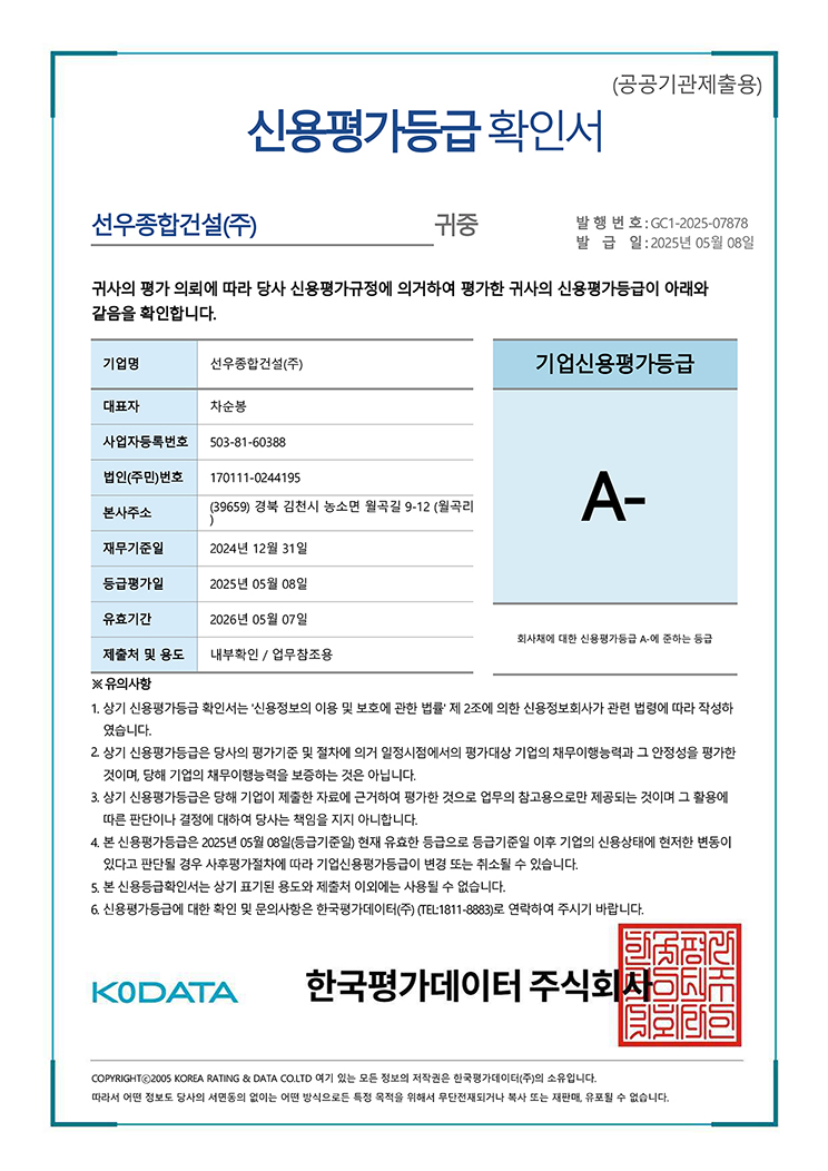 신용평가등급확인서(2025년)_선우종합건설(주)